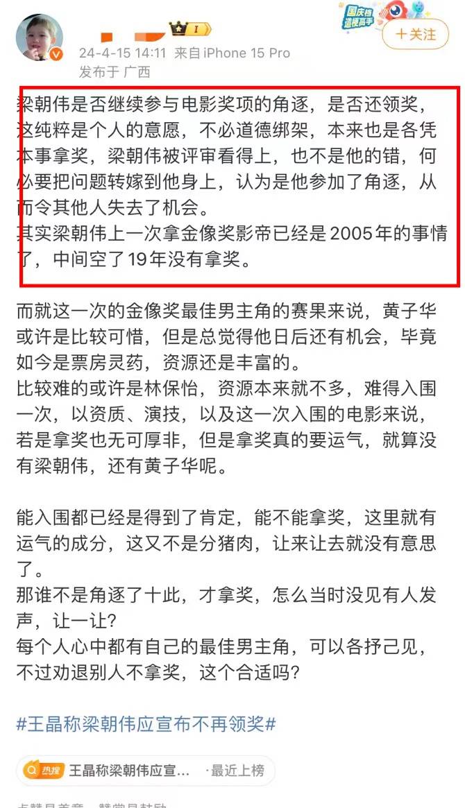 原标题:梁朝伟19年没拿奖,还要道德绑架,王晶要他放弃领奖言论引发热议