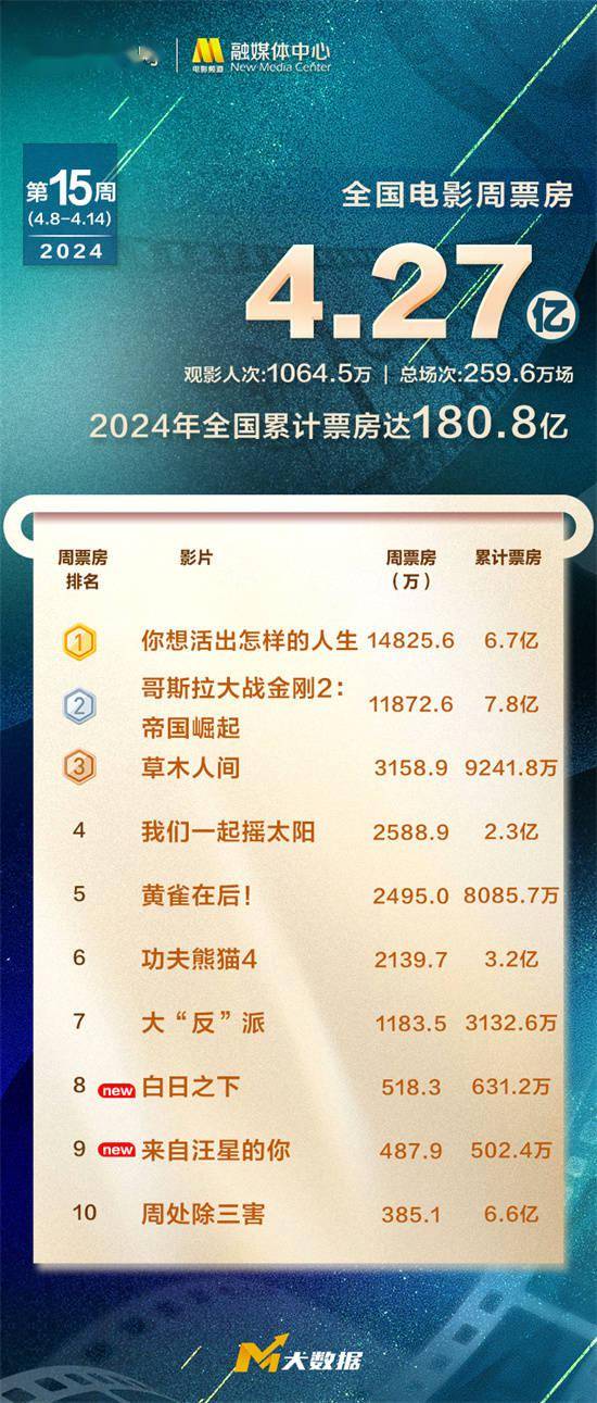 1905电影网讯 2024年第15周(4.8-4.14)全国电影周票房4.27亿,观影人次超1064万,总场次259.6万场,2024全年电影票房累计超180亿。