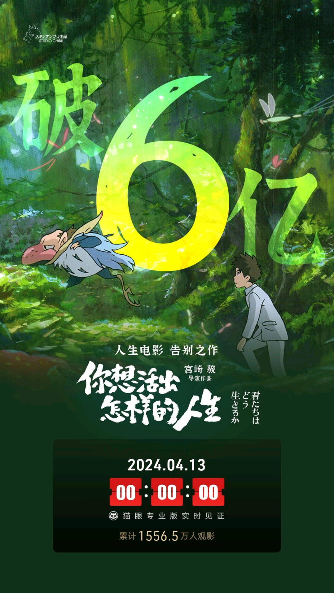 宫崎骏动画新作《你想活出怎样的人生》次周揽1.48亿夺冠,连续11天稳居单日票房冠军,上映12天累计票房6.66亿,成为继《铃芽之旅》《灌篮高手》后第三部累计票房破6亿的日本动画。