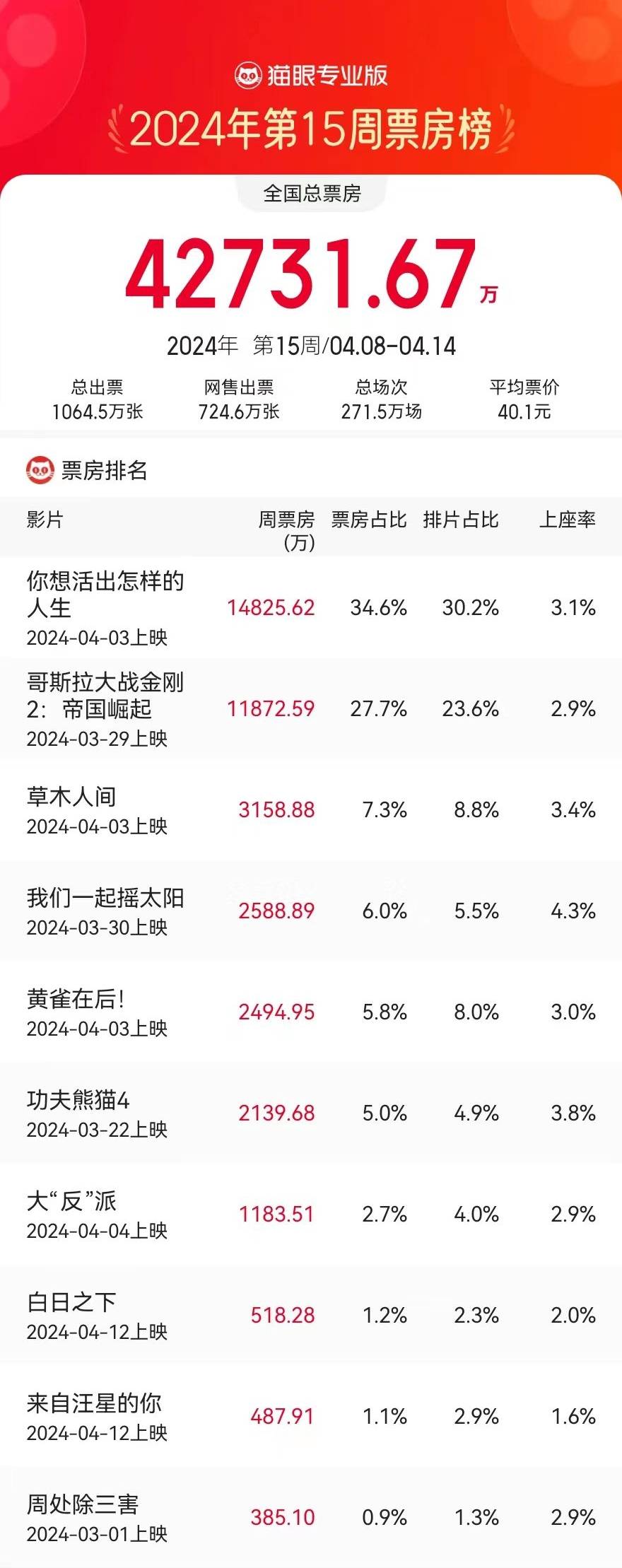 原标题:4.8-4.14内地周票房4.27亿 《你想活出怎样的人生》1.48亿两连冠,累计6.66亿