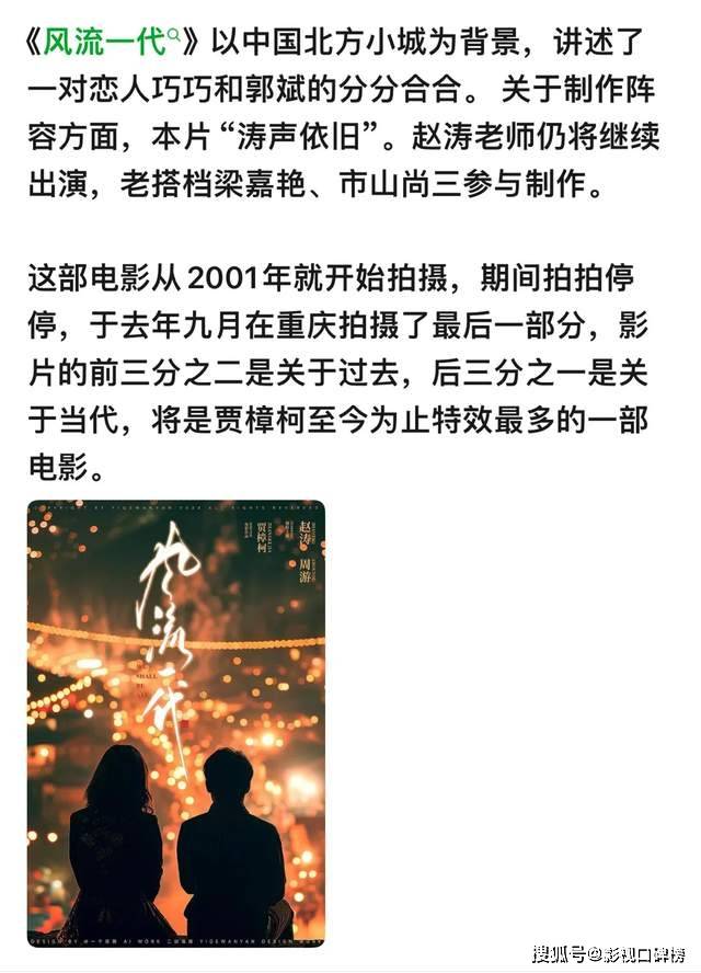 第77届戛纳电影节公布入围片单,由贾樟柯导演执导的电影《风流一代》宣布入围本届戛纳电影节主竞赛单元,该影片由演员赵涛主演,周游、仁科等特别出演,是贾樟柯22年来第六次入围戛纳电影节主竞赛单元。