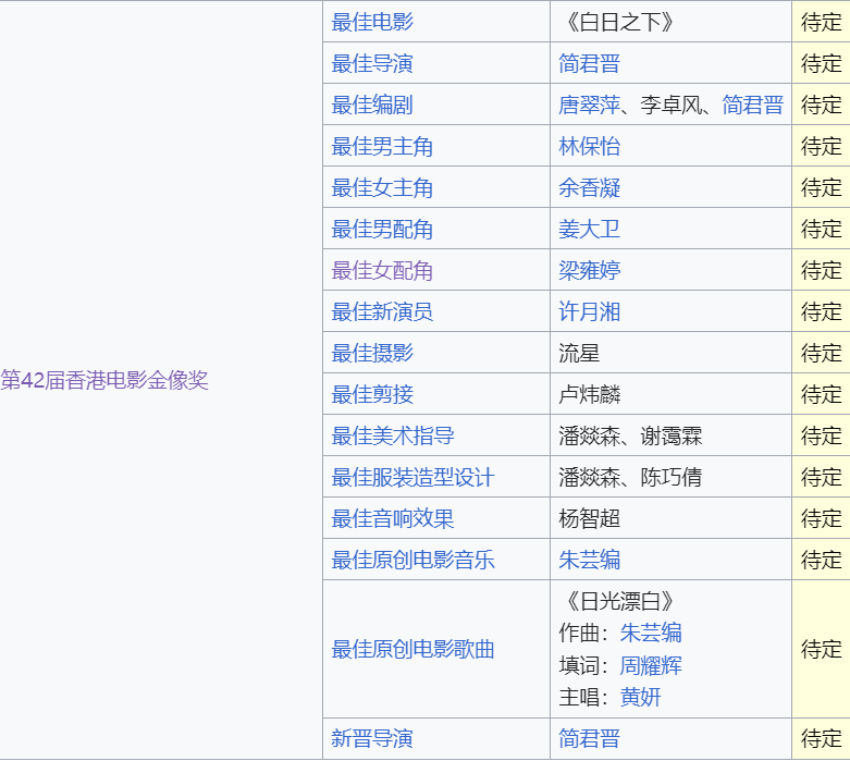《白日之下》是提名最多的影片,获得包括最佳电影在内的16项提名;《年少日记》《金手指》紧随其后,获得12项提名;《毒舌大状》《命案》获得10项提名。