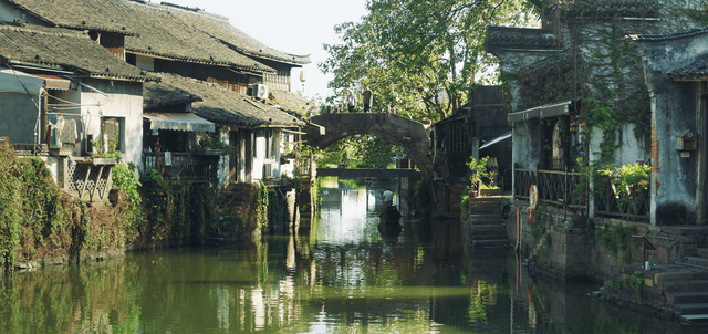 依水而建的老屋,青苔傍身,小桥流水,船家摇着橹从桥下经过。