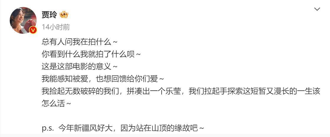 而最后那句“今年新疆风好大,因为站在山顶的缘故吧~” 则彰显了贾玲的骄傲。《热辣滚烫》上映两周,票房突破31亿,中国票房最高的女导演、两部作品均进入中国电影票房榜前20,巾帼不让须眉的贾玲不再谦虚,没错,老娘就是站在山顶。