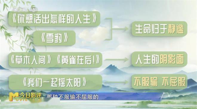 例如清明档影片《你想活出怎样的人生》和《雪豹》,是在告诉我观众生命终将回归静谧;像《草木人间》和《黄雀在后!》反映的是人生的阴影面;而《我们一起摇太阳》又鼓励观众在面对人生困苦时,要有不服输不屈服的精神状态......这几部电影便能满足不同观众对于生命的思考。