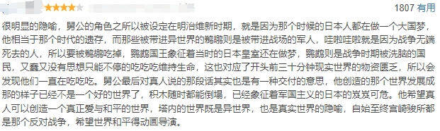 这种解读方向有一定合理性:影片故事设定在1944年,有战时日本平民生活背景写实的一面,且宫崎骏前作《起风了》也是二战题材;同时宫崎骏“反战左翼”的形象在中国深入人心,但在其作品中“反战思想”的呈现方式是否妥当上,也不是完全没有争议。