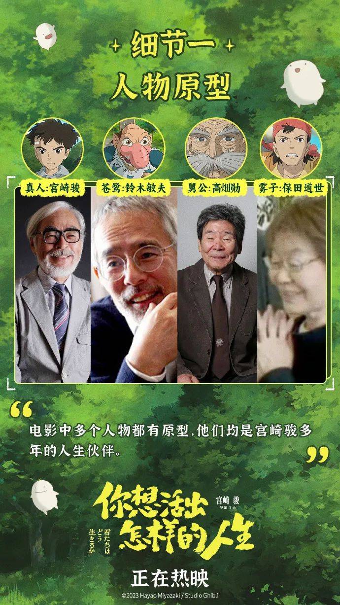 另外,最早出现在海报上的苍鹭在影片中是真人狡猾、贫嘴的队友,是宫崎骏按着老搭档、吉卜力董事长铃木敏夫的形象设计的。