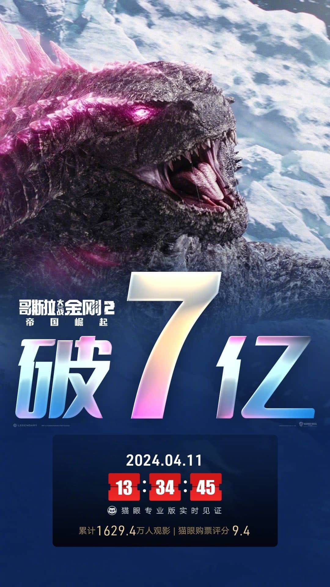 搜狐娱乐讯 据猫眼专业版数据,截至4月11日13:34,“怪兽宇宙”系列新电影、科幻动作视效大片《哥斯拉大战金刚2:帝国崛起》上映第14天 ,累计票房破7亿。累计观影人次1629.4万。