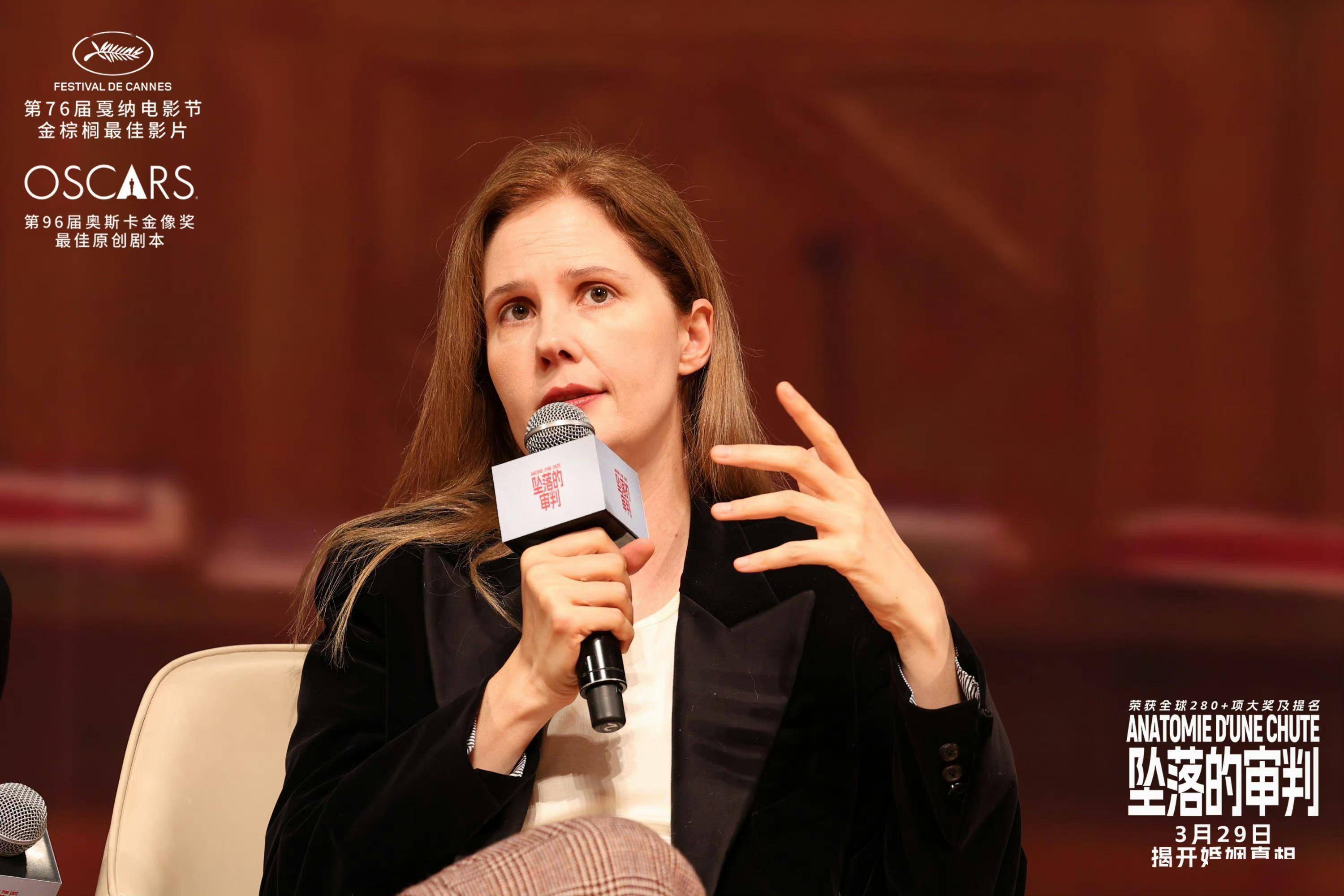 中国首映礼上,导演茹斯汀·特里耶用中文给大家打招呼,并表示这是第一次来中国,想来听听中国观众的想法。在对谈中,她表示这部电影的叙事结构既复杂又简单,旨在深入探索夫妇的生活并理解他们的关系。