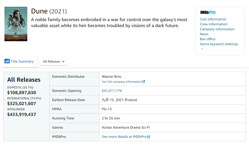 《沙丘》于2021年上映,全球票房4.34亿美元。