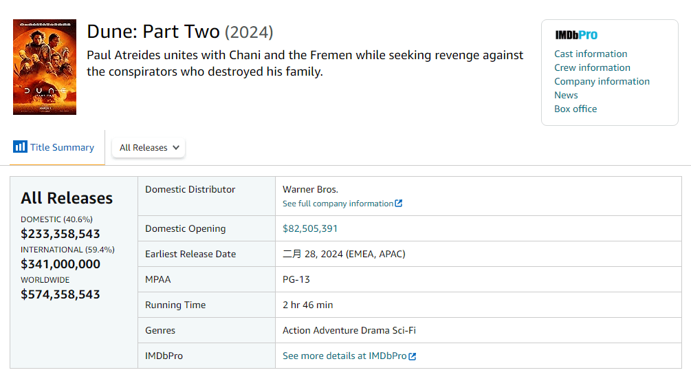 《沙丘2》正在热映中,目前全球累计票房5.74亿美元。