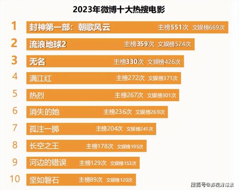2024年3月22日,微博发布了“2023微博电影白皮书”,微博十大热搜电影分别是:《封神第一部:朝歌风云》《流浪地球2》《无名》《满江红》《热烈》《消失的她》《孤注一掷》《长空之王》《河边的错误》《坚如磐石》。