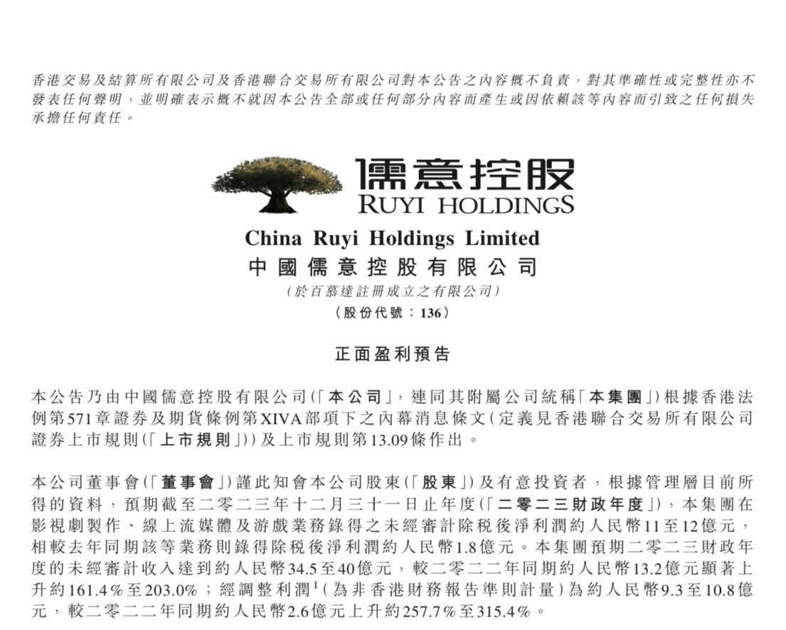 1905电影网讯3月21日晚,港股上市影企中国儒意发布正面盈利公告。该公告显示,公司2023年未经审计的营业收入约人民币34.5亿元至40亿元,除税净利润约人民币11亿元至12亿元。