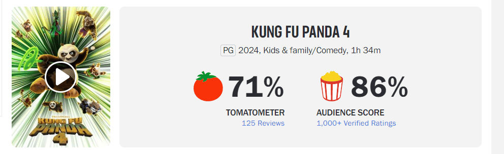 目前《功夫熊猫4》首映了一天,就已经接近1亿票房了。这个周末,家长们带着孩子进场,冲到2亿票房可能性很大。但是这部迟到了8年的《功夫熊猫4》,预算成本从前作的1.5亿美元削减到8500万美元,大幅缩水43%。根据烂番茄目前的口碑,尚且不错。普通话配音找到了黄渤、蒋欣和杨幂,孩子们观看起来也无压力。