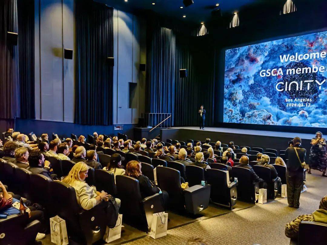洛杉矶当地时间3月12日晚,中影CINITY团队作为GSCA(国际巨幕影院协会,以下简称巨幕协会)会员,应邀出席了其组织的专场CINITY演示会。演示会在洛杉矶Harmony Gold影院举行,由巨幕协会执行董事Tammy主持,来自各国的近200名会员参加了演示会。CINITY团队在演示会上向在场的GSCA会员介绍了中影CINITY旗下的CINITY,CINITY LED,CINITY SCIENCE三大高新技术格式电影放映品牌。