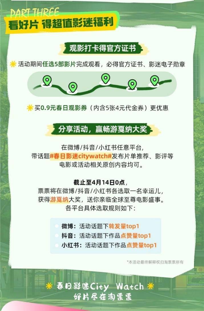 3月22日-4月22日,用户使用0.9元购买春日观影券包,即可获得5张4元无门槛观影代金券,活动期间购买任意五部影片并完成观影,便可拥有由淘票票颁发的实体影迷证书和电子影迷勋章。在微博、抖音、小红书平台带指定话题发布活动相关内容,还有机会赢得畅游戛纳的惊喜大奖,亲临全球至尊电影盛事。此外,活动期间电影主创、影评人等众多春日好片推荐官,还将以线下活动、直播连麦等形式为影迷们花式荐片。