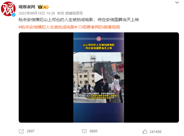 中国网友对于这部影片的关注热度不低,这中间的一个重要原因是安倍作为日本右翼修宪派政治家,不受我国舆论欢迎,故而对他的被刺,大伙多少抱着一些“看乐子”心态。而安倍被刺案要被拍成电影赶在国葬日之前上映的消息,早在当年9月就已在中文网络广泛流传。