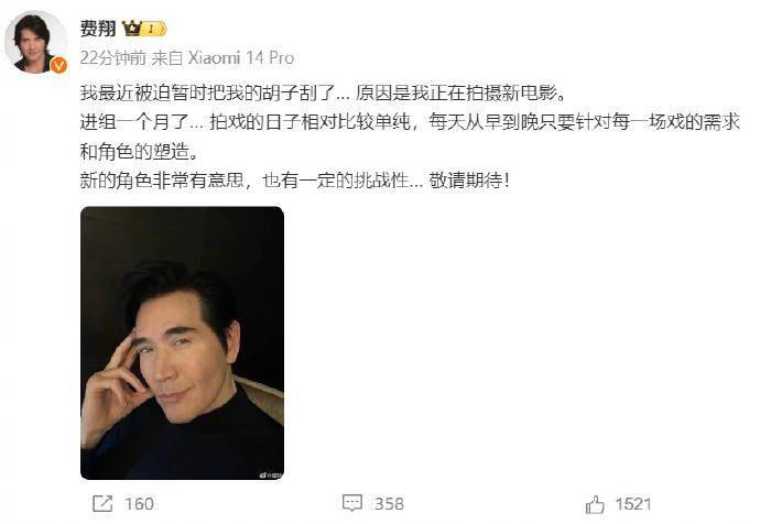 原标题:费翔晒自拍透露进组新电影 为新作刮胡子帅气依旧