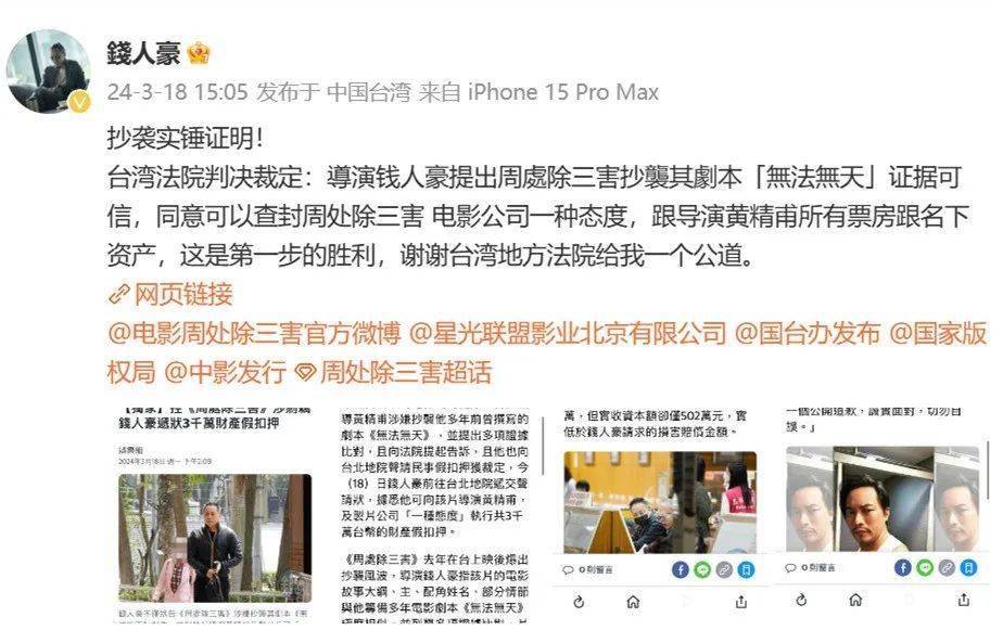 首先,由于影片票房持续走高,热度不减,钱人豪导演对该片编剧、导演黄精甫涉嫌抄袭的控告,引发了越来越广泛的关注。在全网的推波助澜下,台湾法院近日判决裁定,同意暂时扣押制片公司一种态度电影股份有限公司,和黄精甫所有票房及名下资产。