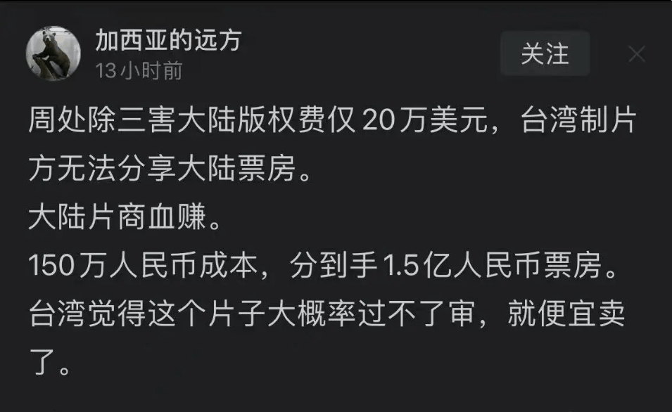 如此看来,虽然《周处除三害》大爆的背后,台湾制片方回本无忧了,而中影、阿里这样的行业巨头在大口吃肉,星光联盟凭借眼光和胆魄,成功实现了以小博大,有望以三四百万的版权买断费,换来1个“小目标”。