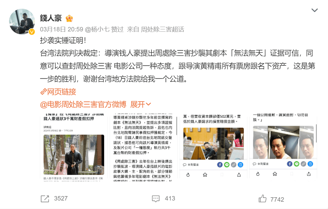 当然,这么写并不是站队,只是指出钱人豪的夸大其词,到底有没有抄袭,还要看法院怎么判,在这里不做道德审判吧。但换个角度,如果《周处除三害》口碑稀烂、票房扑街、被观众骂的体无完肤,认为人物和剧情写的不好,钱人豪还会跳出来背锅吗?说到底,还是成功惹来的麻烦吧!
