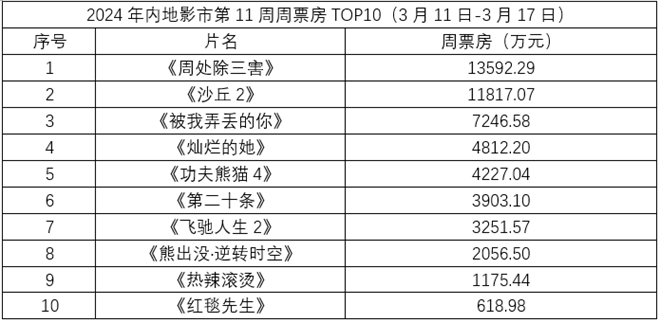 1905电影网专稿2024年第11周(3月11日-3月17日),内地大盘报收约5.4亿,数据较此前一周有所回落。依然保持着相当热度,蝉联周榜冠军,累计票房已成功突破5亿。维伦纽瓦执导的紧随其后,累计2.6亿票房也帮助影片暂时成为2024年进口片票房第一。