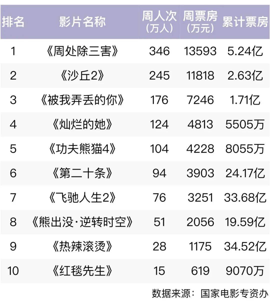 《周处除三害》上周收获票房1.3亿,夺得周票房榜冠军。该片已连续两周夺得周榜冠军,目前累计票房已达5.20亿,观看人次突破一千万。