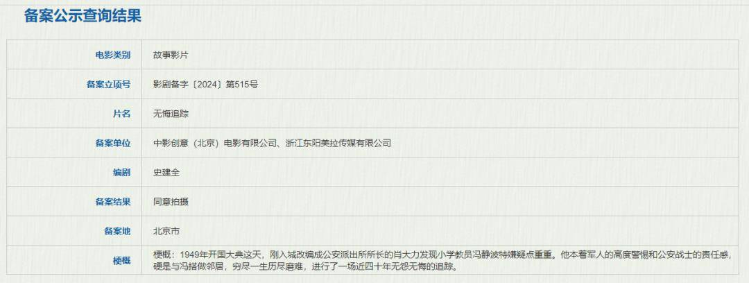 30年后,电影版《无悔追踪》备案,编剧依然是史健全,剧情仍是派出所所长肖大力追踪敌特冯静波近40年。