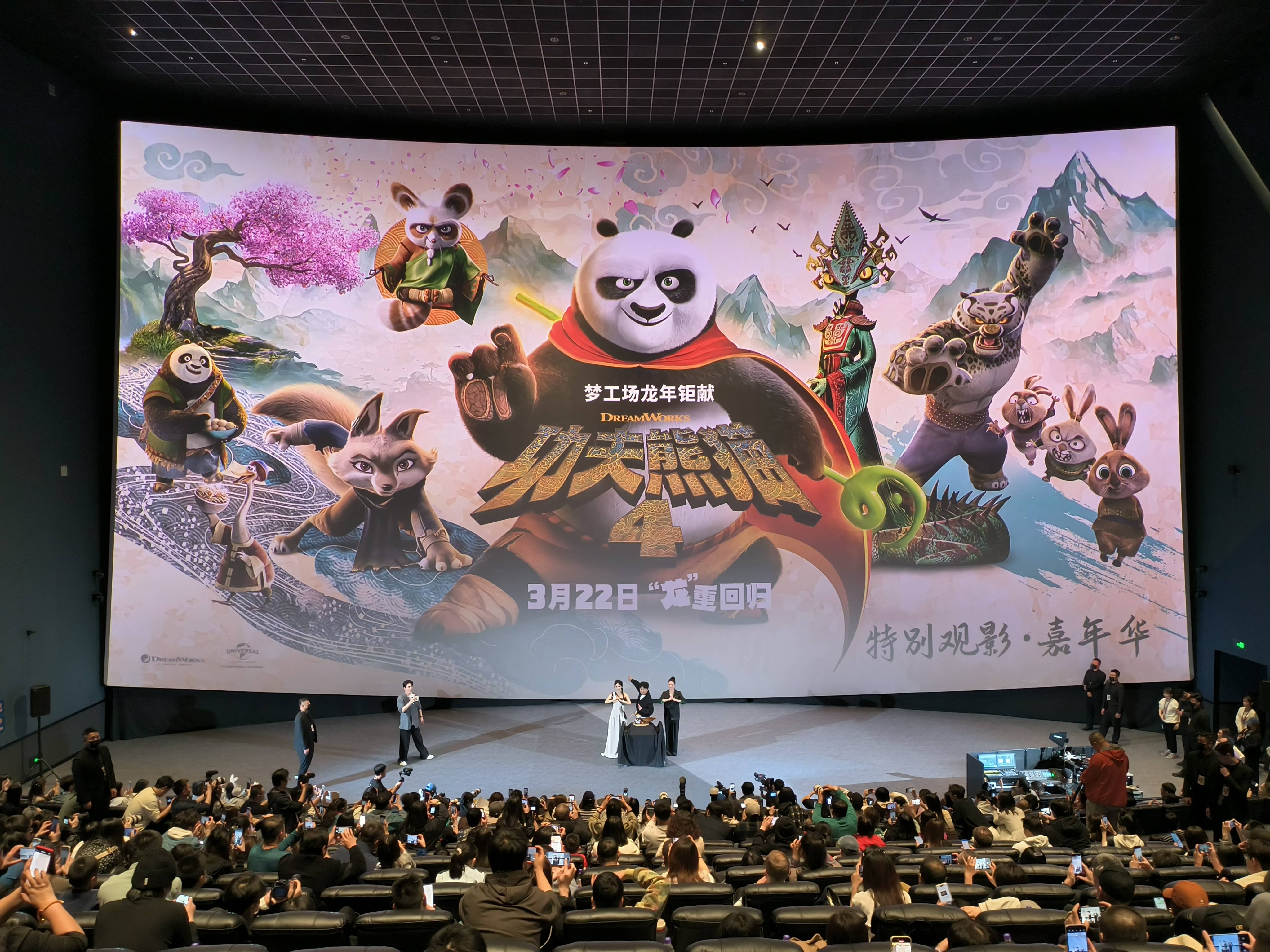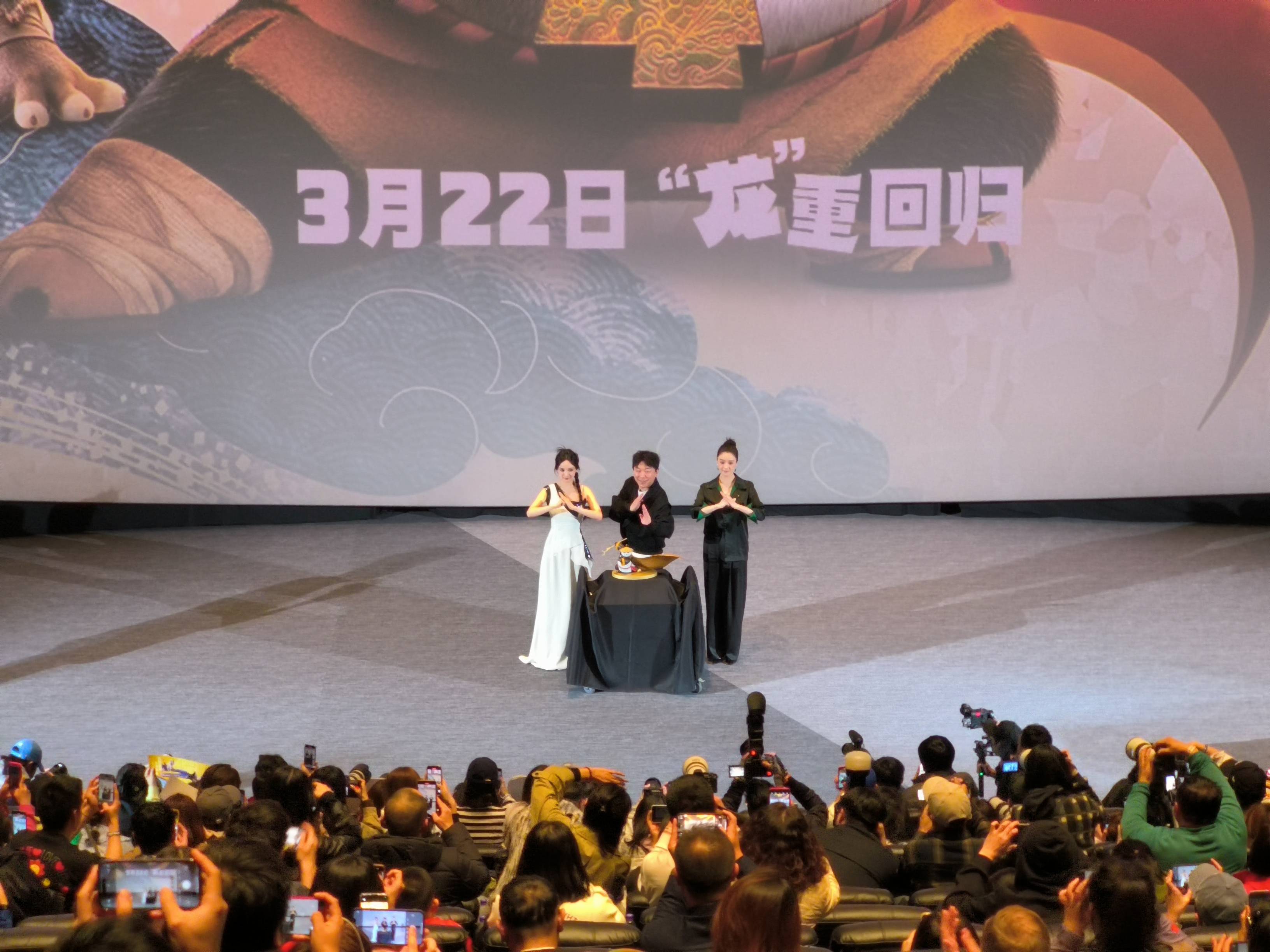搜狐娱乐讯 (哈麦/文)3月14日,电影《功夫熊猫4》在北京环球城市大道电影院首映,作为配音演员的黄渤、杨幂、蒋欣出席映后见面会和观众交流。