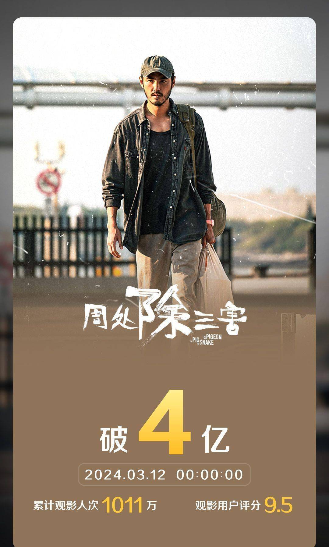 1905电影网讯3月12日,电影《周处除三害》票房突破4亿元,观影总人次超1000万。影片自3月1日起在中国内地院线上映,口碑不俗,豆瓣评分8.1。