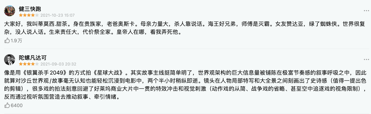早在《沙丘1》刚上映的时候,网络上面就出现了很多负面评价,因为这部电影打着鸿篇巨制、科幻大作的旗号,但是很多人感受不到,这部电影跟其他的普通小成本科幻片有什么样的天壤之别。