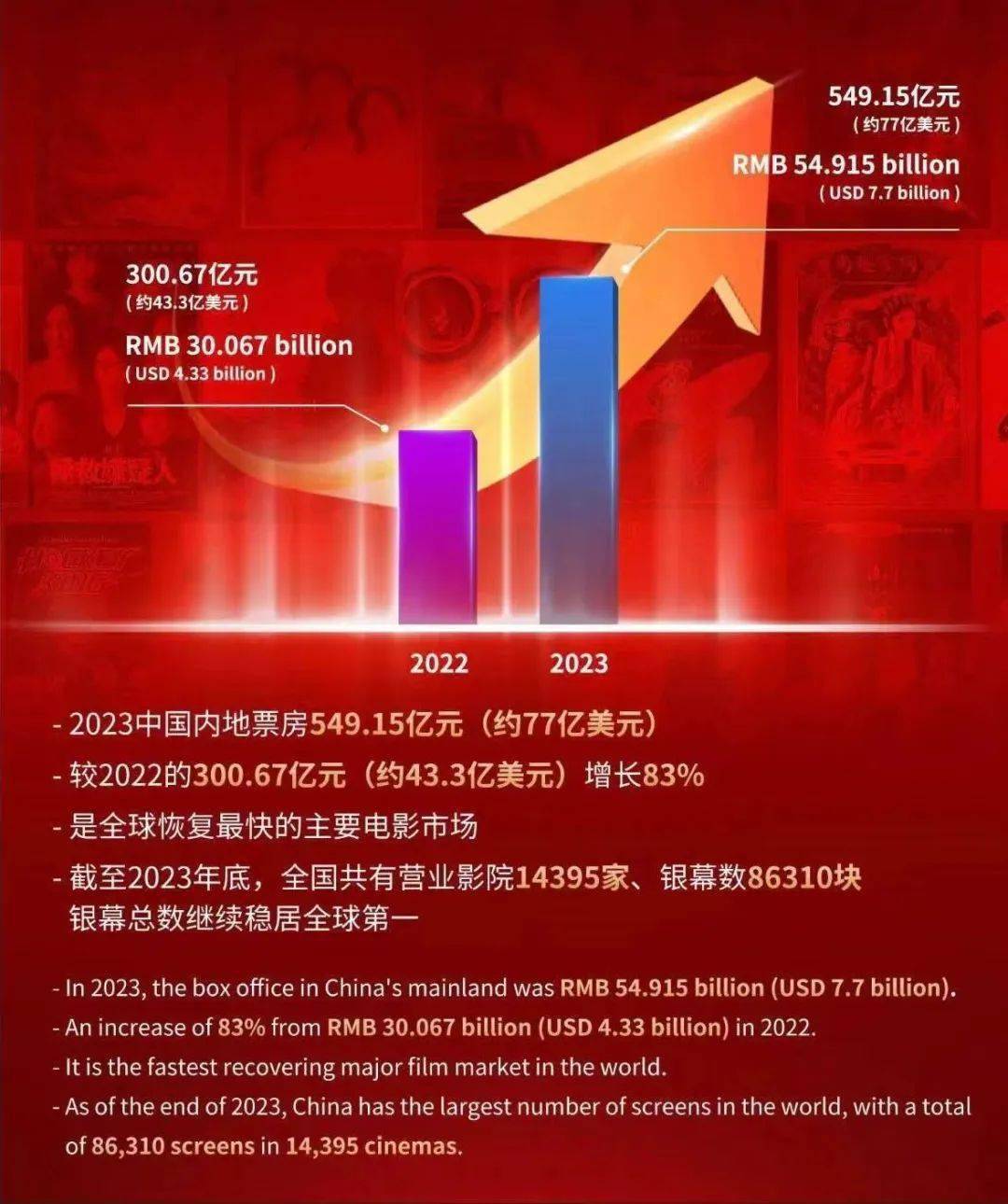 2023年中国内地电影票房549.15亿元,约合77亿美元,较去年的43.3亿美元增长83%,是全球恢复最快的主要电影市场。2024年春节假期全国电影票房为80.16亿元,观影人次为1.63亿,相比2023年春节假期票房和人次分别增长了18.47%和26.36%,均创造了同档期新的纪录。截至3月10日,2024中国电影市场年度票房已经突破150亿元。