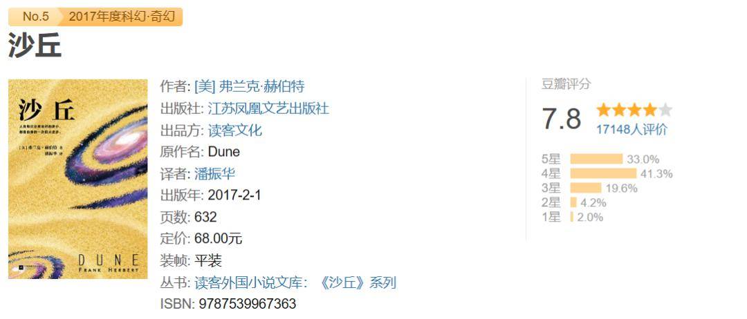 弗兰克·赫伯特所著的长篇科幻小说《沙丘》,是首部同时获得雨果奖与星云奖的作品,是各种“必读榜单”的常客。后期通过不断地续写和拓展,赫伯特将其写成了一个恢弘的系列。
