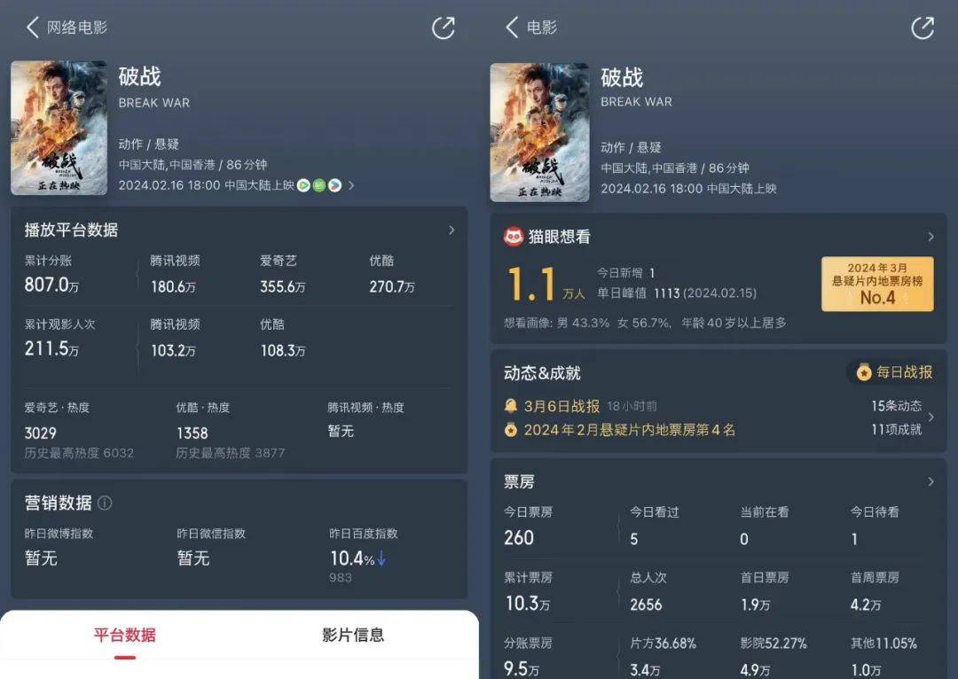 无独有偶,在2月16日院网同步的《破战》在院线市场也有着相似的待遇。截至目前,猫眼专业版显示该片仍在上映中,然而累计票房仅有10.3万。与此相对的,影片在爱优腾三平台拼播累计分账票房已经突破了800万关口,成绩虽不算突出,相较院线票房已经好看了太多。