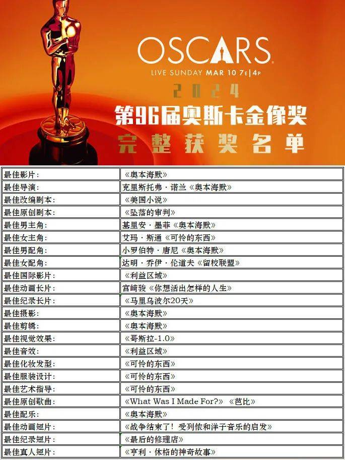 无论如何,这都是一届值得被铭记的奥斯卡,即便入围13项提名的《奥本海默》未能创造飓风过境般的横扫盛况,但其包揽最佳影片、导演、男主角、男配角、摄影、剪辑、原创配乐在内的7项大奖,还是让这个“诺兰年”有了最圆满的收尾。