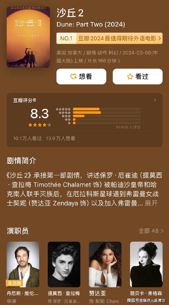 原标题:科幻大片《沙丘2》豆瓣评分上涨,单日票房仅次于《周处除三害》