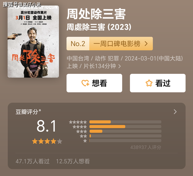 但是,从三月份上映的电影来看,有多部口碑和质量都很高的电影相继上映,甚至不少网友都觉得这些大片完全不输之前的春节档,因为在3月1日上映的台湾地区电影《周处除三害》就堪称本月的绝对黑马,上映7天已经达到了2亿之多,这也是近些年湾湾地区在内地上映电影票房较高的作品了。
