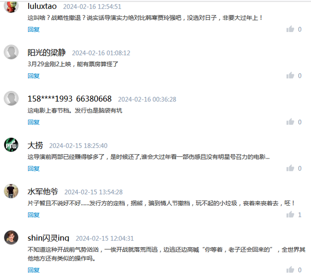 而《红毯先生》网友对于重新定档,更是讽刺得厉害,有人认为《沙丘2》《周处》前后夹击,死翘翘的!还有人认为逃档的,信任一旦摧毁,再建不那么容易。