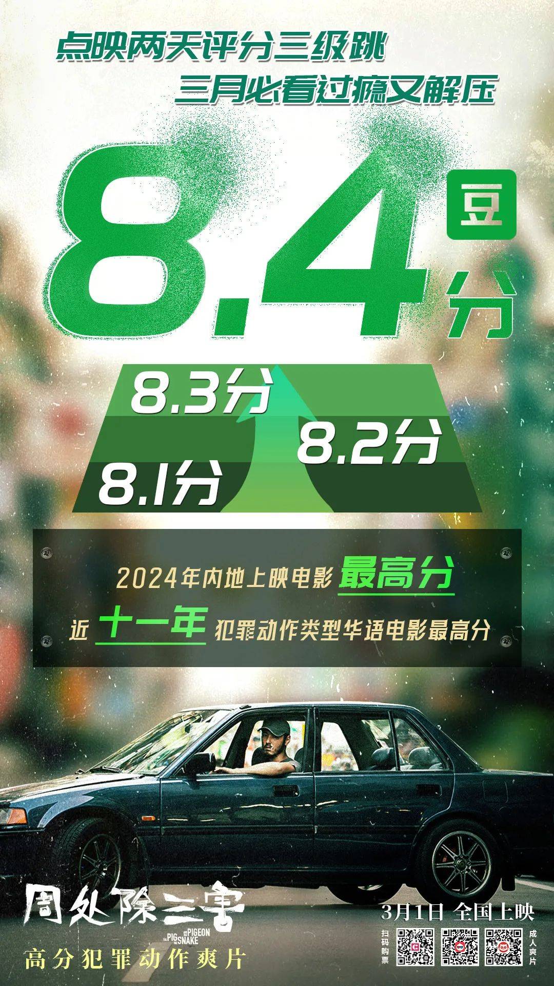 有金马奖及台湾优质先期口碑加持,有不少影迷观众都慕名而来,仅在点映两日就将影片豆瓣评分从8.1送至8.4(现已回落至8.2分),创下今年内地上映电影最高分与近十一年犯罪动作华语电影最高分,为《周处除三害》后续突围奠定了坚实口碑基础。