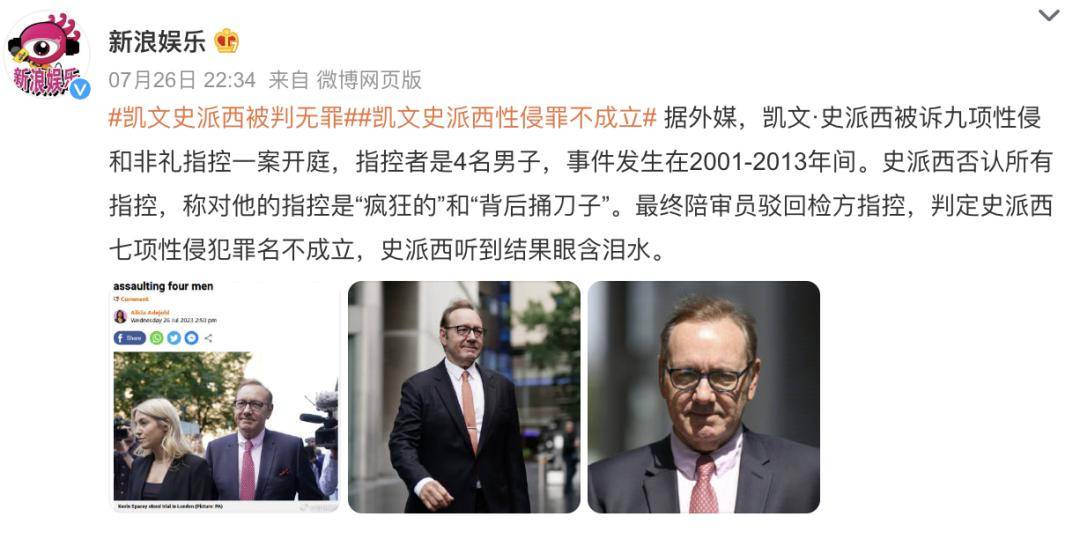 去年,法庭宣判,凯文·史派西多项性侵罪名不成立。