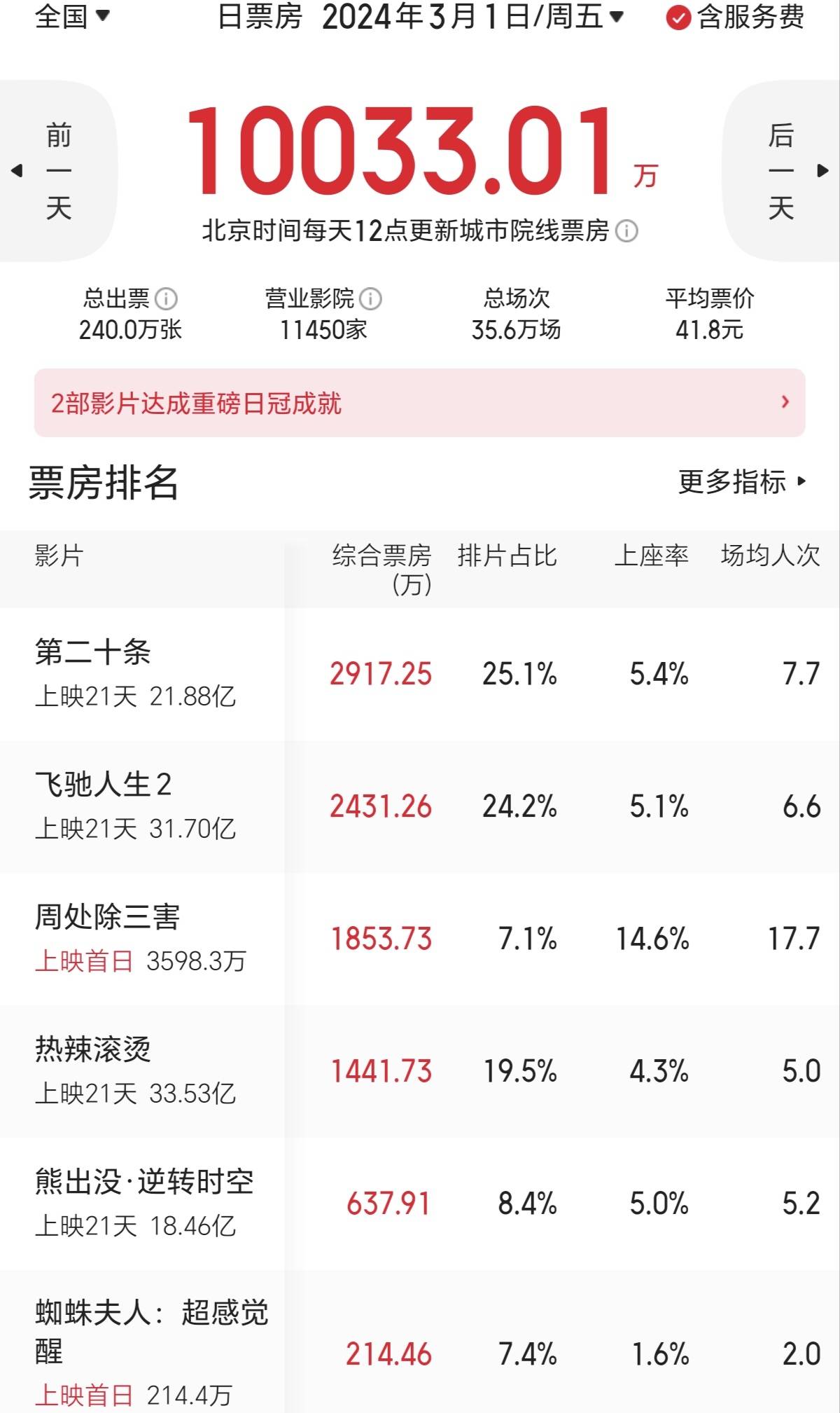 另一部来自好莱坞的新片《蜘蛛夫人:超感觉醒》表现不佳,首日排片7.4%,收票房214万元,上座率1.6%,远远垫底。