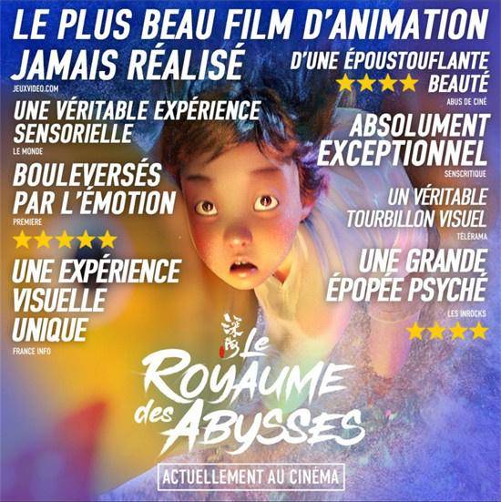 日前,由田晓鹏导演的国漫《深海》正在法国上映,500余家影院上万场次排片,打破中国动画电影在法国放映场次最多的纪录。影片凭借独特的视觉效果与感人至深的故事打动了法国媒体与观众,收获高口碑。当地媒体盛赞影片是“有史以来最美的动画电影”,“一次真正的感官盛宴”。许多法国观众在观影后也给出了极高评价,称《深海》是自己看过的最棒的动画电影。