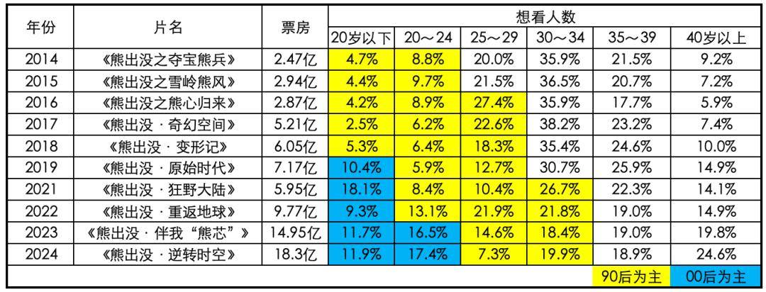 但明显的是,90后观众在2022年前后,数值达到了巅峰,一方面是该年龄层的观众多数进入婚育年纪,另一方面,《熊出没》系列电影逐渐找到更适配成人观众的内容。