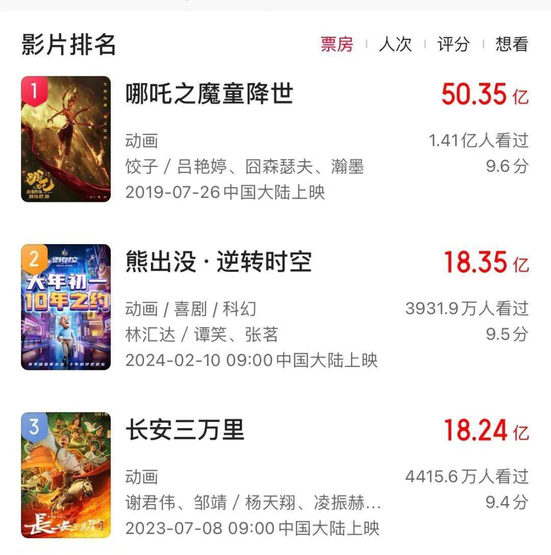动画电影《熊出没·逆转时空》票房累积超18.35亿,超越了此前动画电影《长安三万里》18.24亿的总票房,成为中国影史动画电影票房第二名。