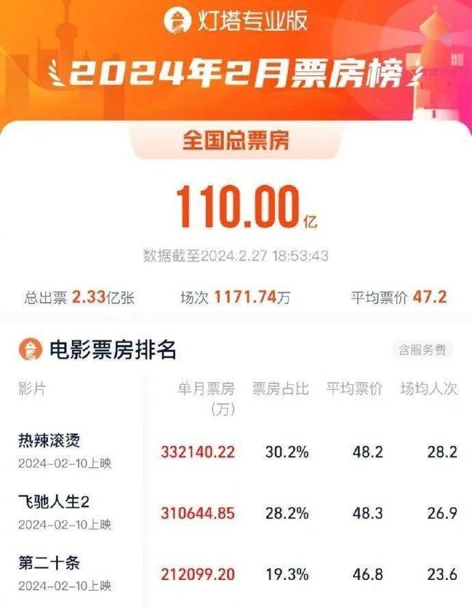 据灯塔专业版,截至2月27日18时53分,2024年2月总票房(含预售)破110亿。《热辣滚烫》《飞驰人生2》《第二十条》暂列本月票房前三位。本月票房也成为当前中国影史单月票房第三位。