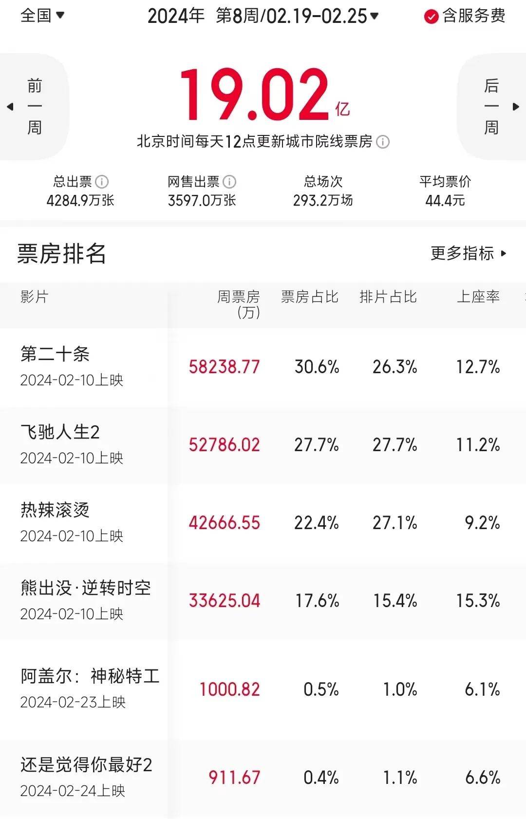 作为春节假期彻底完结后的第一个整周,因两部新片成绩惨淡,上周院线票房仍主要由四部春节档大片贡献。据猫眼专业版数据,02.19-02.25一周内地票房报收19.02亿,较前一周的61.31亿下跌68.98%。