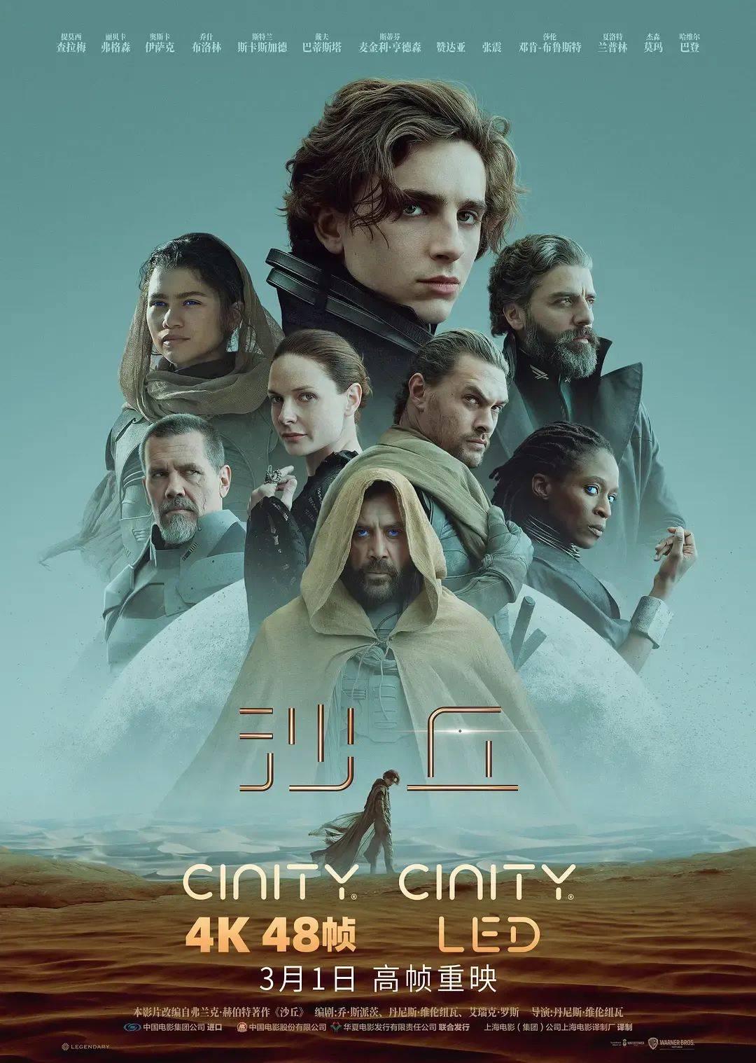 由丹尼斯·维伦纽瓦执导,提莫西·查拉梅、丽贝卡·弗格森、奥斯卡·伊萨克、哈维尔·巴登、赞达亚、杰森·莫玛、张震等全明星阵容主演的科幻史诗电影《沙丘》第一部将于3月1日(本周五)在内地限定重映十天,仅限IMAX、杜比影院、CINITY和中国巨幕四种特殊影厅放映。