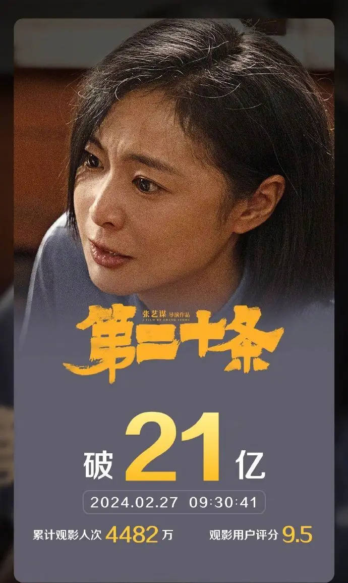 搜狐娱乐讯 2月27日,据灯塔专业版数据,影片《第二十条》票房突破21亿,连续8日取得票房日冠。