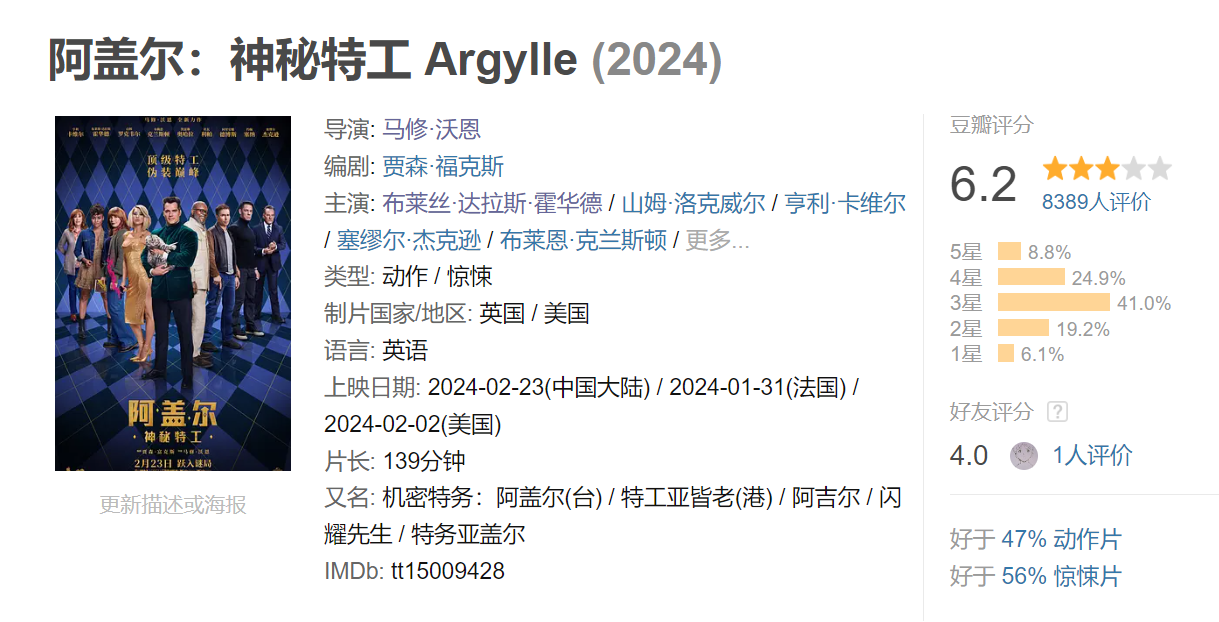 至于口碑,说实话我也很疑惑《阿盖尔:神秘特工》为什么只拿到6.2分,个人至少能给到7.2分,作为爆米花电影,这一部是完全合格的,而且美术、摄影、动作场面都比较良心,可能是因为故事设定有些缺乏新鲜感吧!