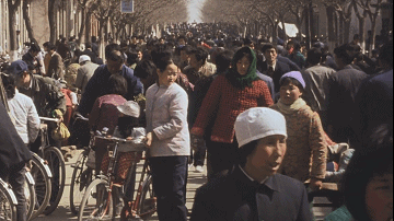秋菊远远走来,人物与九十年代的街道与人群背景交融。